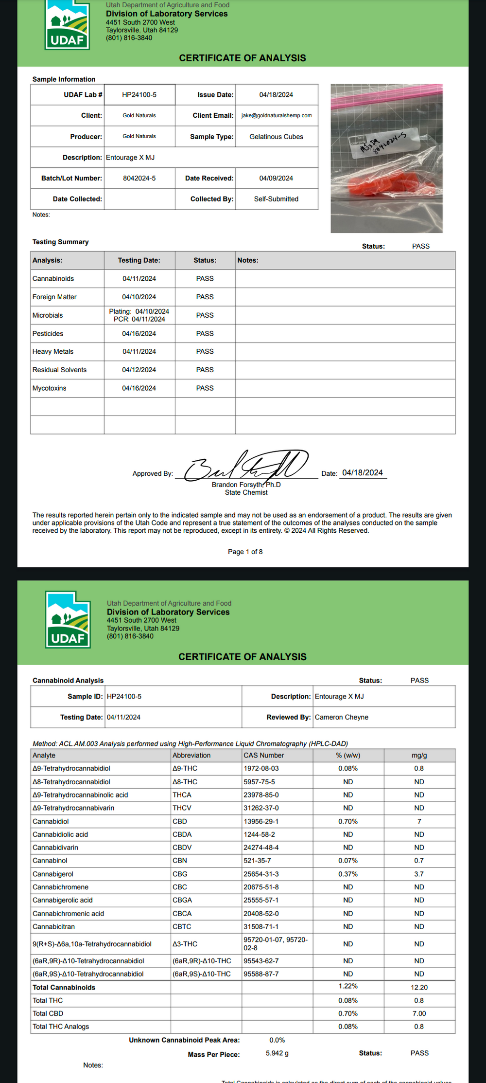 Full-Spectrum Hemp Extract (Δ9 THC, CBD, CBG, CBN, and Minor Cannabinoids); Sugar; Corn Syrup; Water; Pectin; Natural Flavors (Orange Raspberry); Citric Acid; Natural Colors; Trisodium Citrate; Organic MCT Coconut Oil; Sunflower Lecithin; Hemp-Derived Cannabinoids and Essential Oils