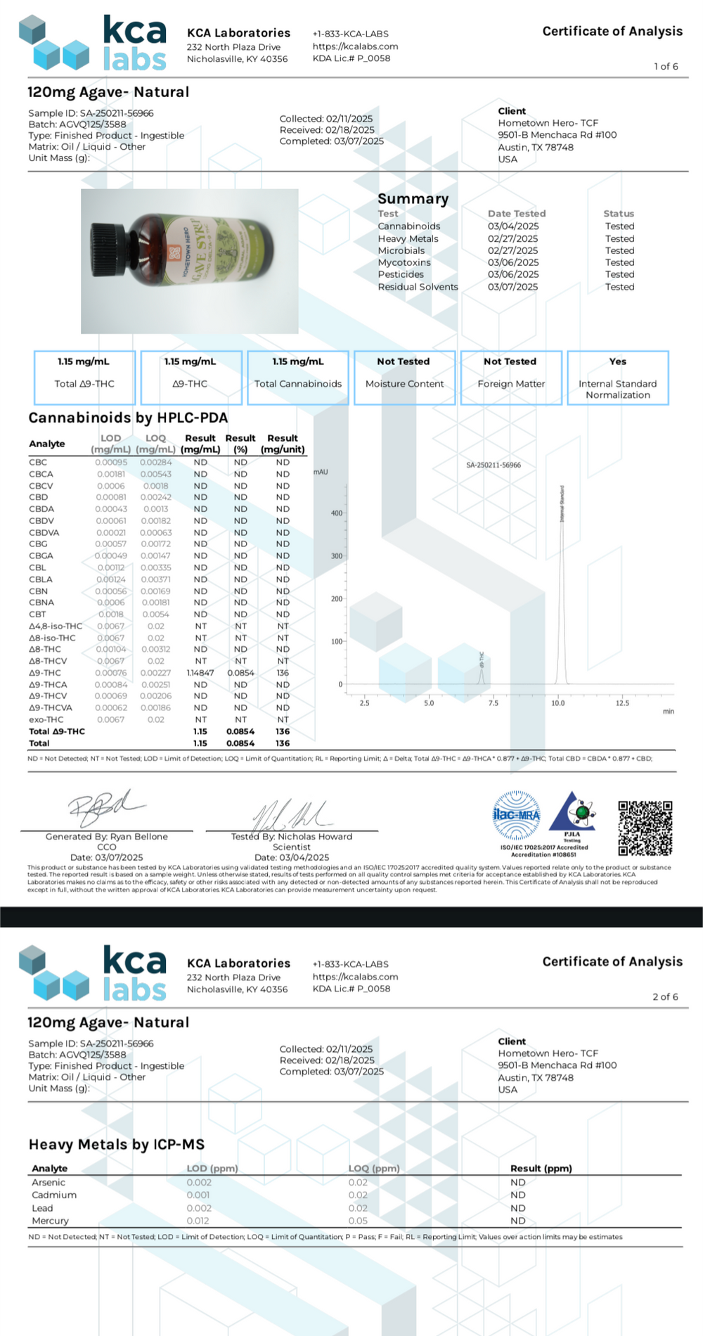 Agave Syrup; Water; Nano-Emulsified Water-Soluble Hemp-Derived Delta-9 THC; Nano-Emulsified MCT Coconut Oil; Natural Mint Flavoring