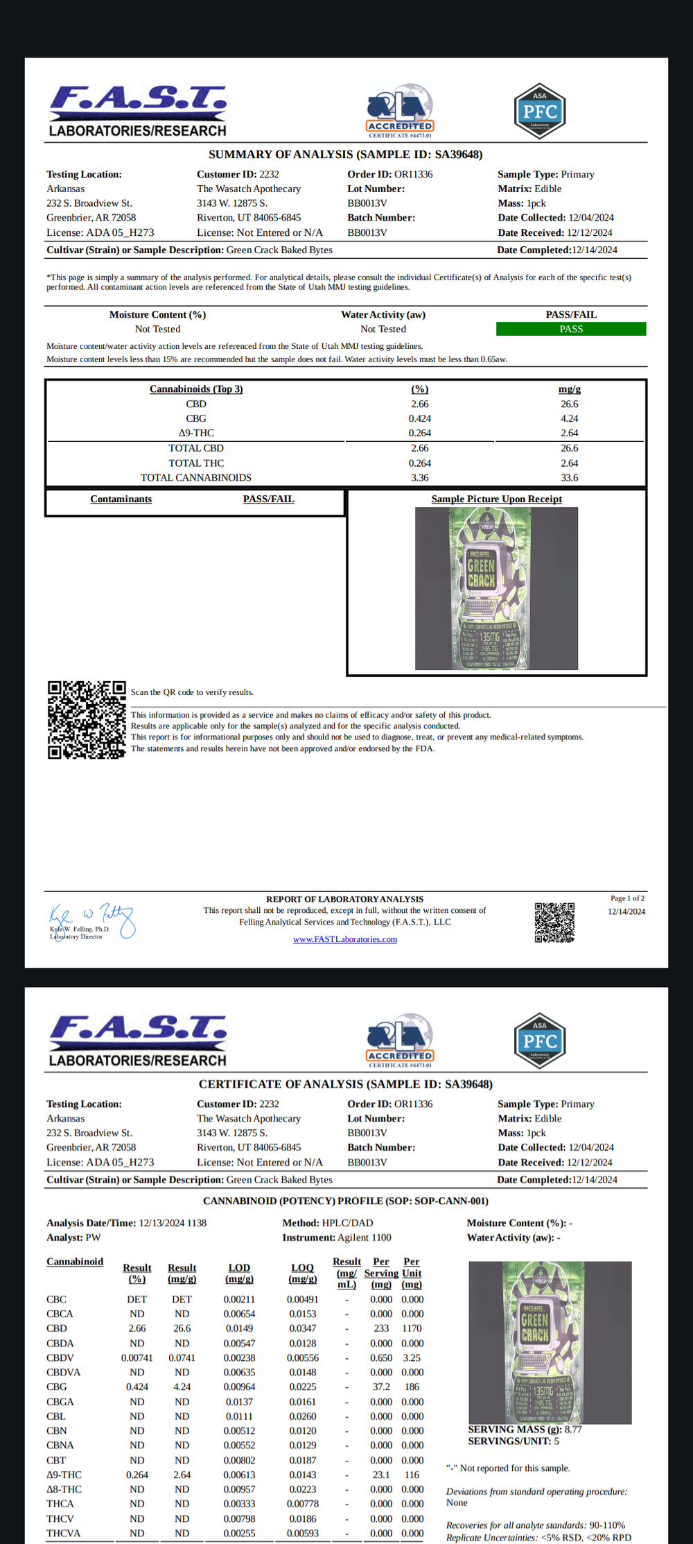 Green Crack Baked Bytes Certificate of Analysis Hemp Derived Cannabis Gummy Edibles 10:1 Formulation Strain: Sativa Dominant Hybrid