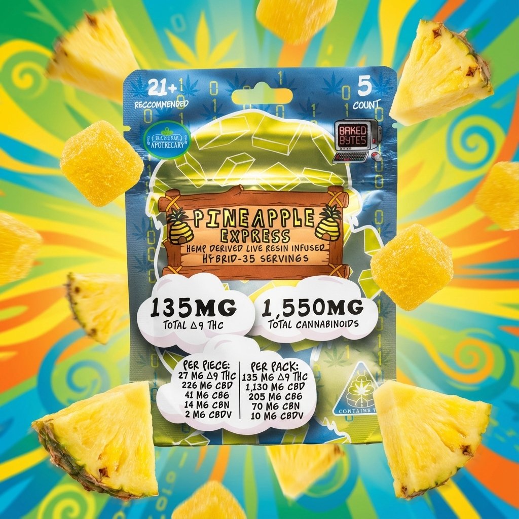 Wasatch Apothecary Baked Bytes Pineapple Express Gummies a burst of sunshine into your day with Wasatch Apothecary Baked Bytes Pineapple Express D9 Full Spectrum THC Gummies, a delicious and uplifting edible inspired by one of the most iconic cannabis strains of all time. Known for its tropical aroma, energetic profile, and feel-good euphoria, Pineapple Express offers a balanced hybrid experience that keeps you clear-headed, motivated, and happily elevated.