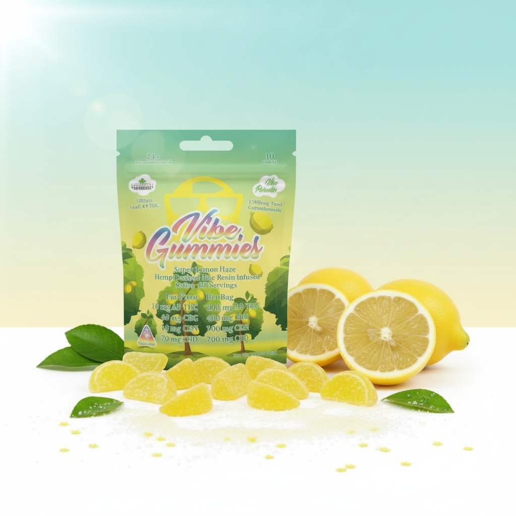 Bright, zesty, and uplifting — Super Lemon Haze Vibe Gummies deliver 10mg of hemp-derived Delta-9 THC per piece for an energized, mood-lifting experience. Crafted with clean ingredients and inspired by the legendary Super Lemon Haze strain, these gummies offer a refreshing citrus flavor and functional, daytime-friendly effects.